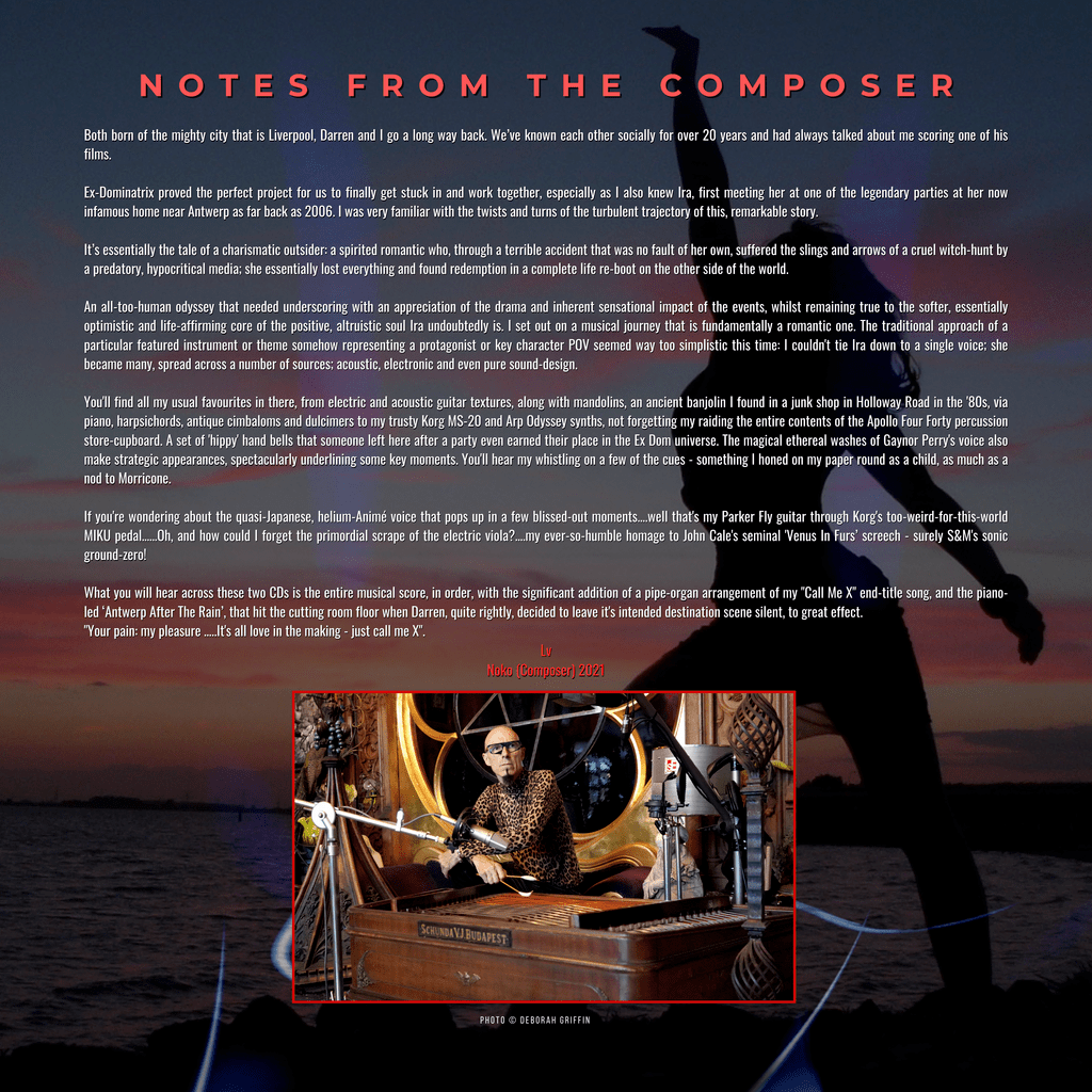 The film score for Ex-Dominatrix a true story is finally available for the first time on a limited edition Double CD release and the first official release from The Very Creativegan Soundtracks.